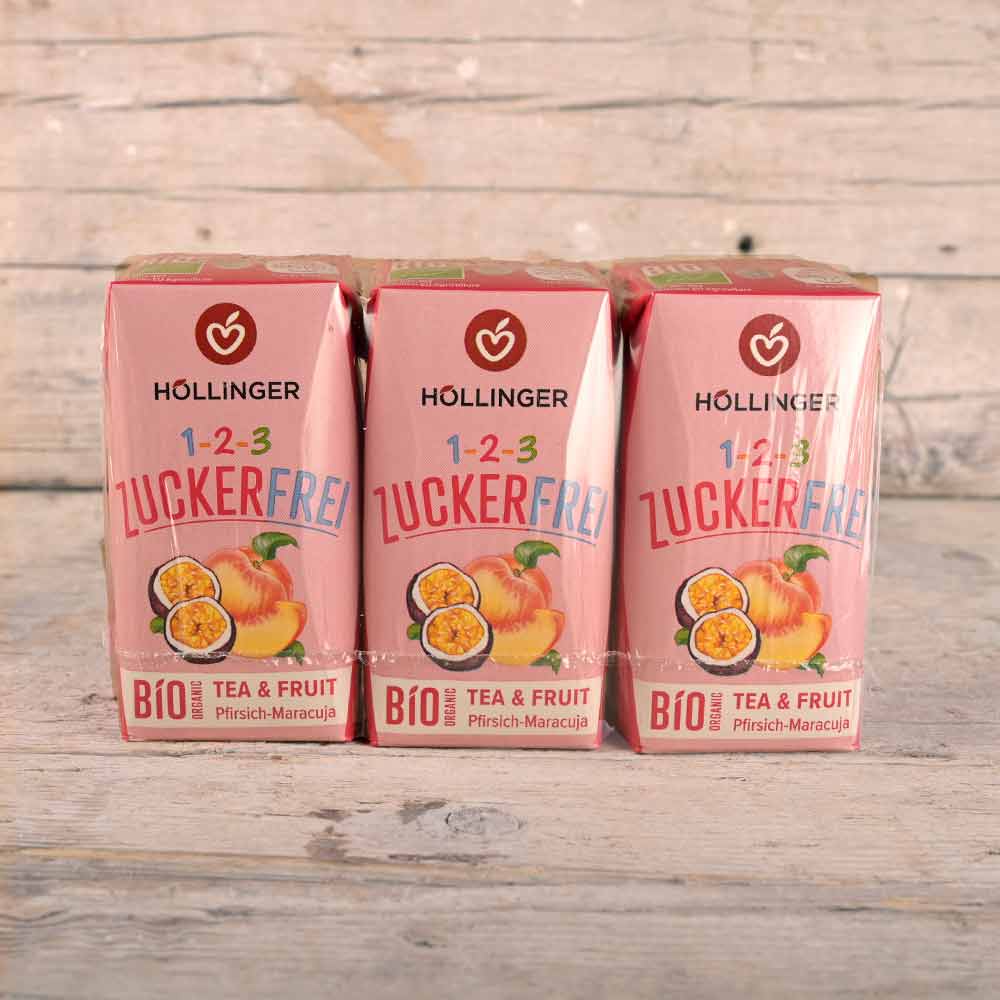 Früchteteeaufguss* (Wasser, Apfel*, Süßblätter*), Mehrfruschtsaft aus Konzentraten* (Zitrone*, Maracuja*), Pfirsichmark*, natürliches Pfirsicharoma, natürliches Passionsfruchtaroma