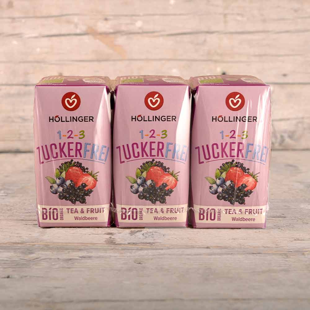 Früchteteeaufguss (Wasser, Apfel*, Hibiskus*, Süßblätter*, Hagebutte*), Mehrfruchtsaft aus Konzentration* (Zitrone*, Johannisbeere*, Heidelbeere*, Holunder*), Erdbeermark*, natürliches Heidelbeeraroma*, natürliches Johannisbeeraroma*