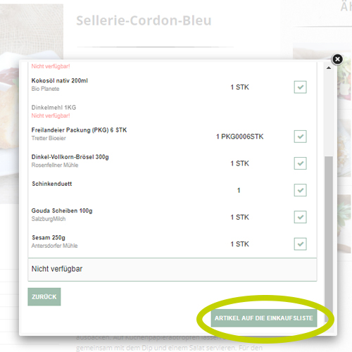 6. dann prüfen, welche Zutaten ihr vielleicht noch zu Hause habt oder mit einkaufen möchtet und die entsprechenden Haken setzen (Achtung - das Obst & Gemüse-Angebot für die Folgewoche steht immer erst ab Dienstag Abend zur Verfügung, ab dann ist die Bestellung möglich)