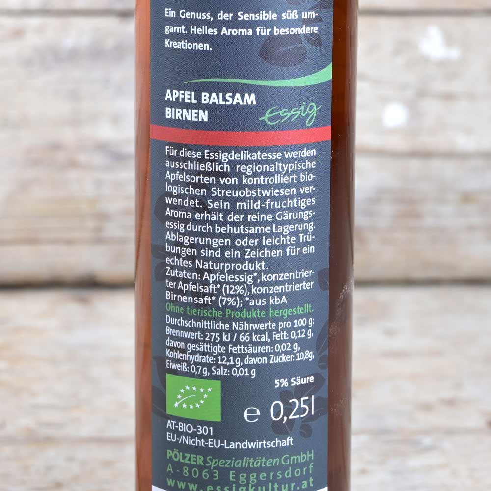 Apfel-Balsamico-Birnen-Essig – eine harmonische Verbindung aus fruchtiger Apfelnote, süßem Balsamico und Birne für geschmackvolle Dressings.