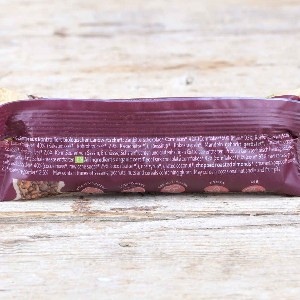 Der Beerige Schoki-Riegel vereint Schoko-Cornflakes, Himbeeren, Mandeln und Kokos. Eine herzhafte Mischung für zwischendurch.