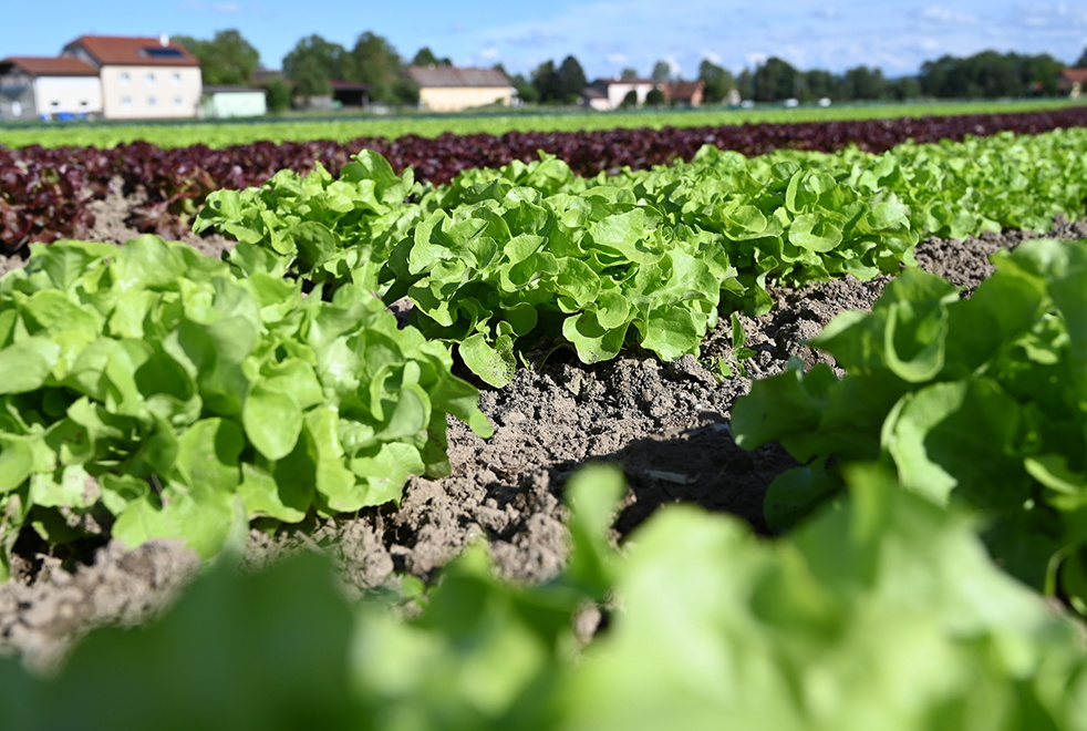 Bunte Salatfelder prägen fast das ganze Jahr über unser Landschaftsbild. Ende Juni, Anfang Juli ernten wir gerade roten und grünen Eichblatt-, Batavia, Kopf- und Eissalate.