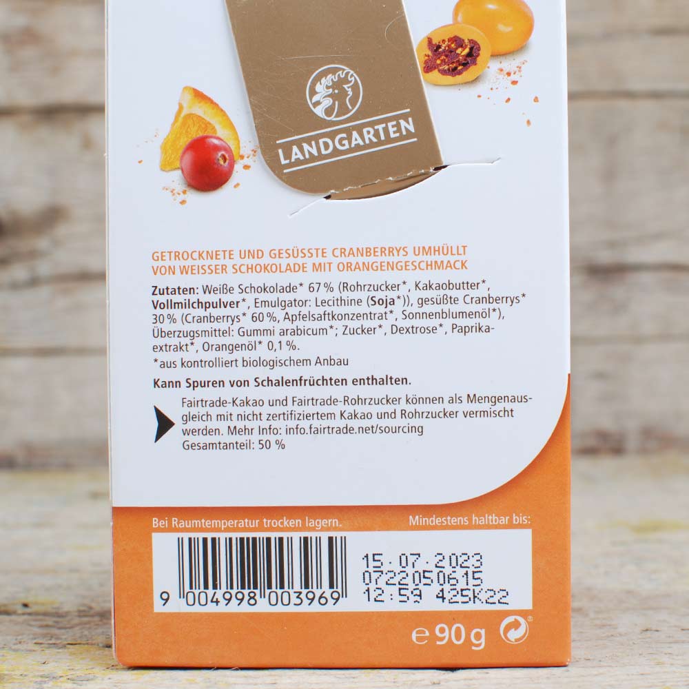 Einzigartiger Geschmack von süßen Cranberrys, umhüllt von weißer Bio-Fairtrade Schokolade. Veredelt mit fein-fruchtiger Orangennote, tauchen Sie mit Landgarten -Cranberry für Dich- in eine Welt puren Genusses – frei von Palmöl und Gluten.