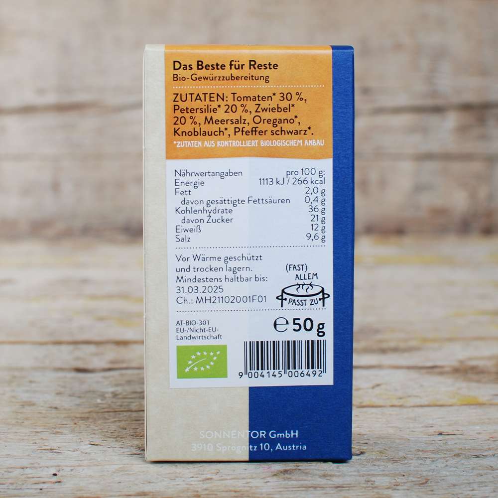 Tomatenflocken*, Petersilie*, Zwiebelstücke gelb*, Meersalz, Oregano*, Knoblauch*, Pfeffer schwarz*