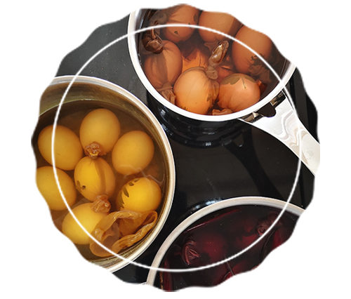 Um Eier natürlich zu färben, einen Sud aus zerkleinertem Obst, Gemüse oder Kräutern bereiten bzw. Saft erwärmen. Den Sud circa 30 Minuten kochen lassen, abseihen und abkühlen lassen. Anschließend mit einem Schuss Essig versetzen, damit die Naturfarben besser auf den Eierschalen halten. Verwendest du direkt einen Saft, dann muss dieser nur erhitzt und ein Schuss Essig beigefügt werden. Eier ins noch warme Farbwasser einlegen und mindestens 30 Minuten ziehen lassen.