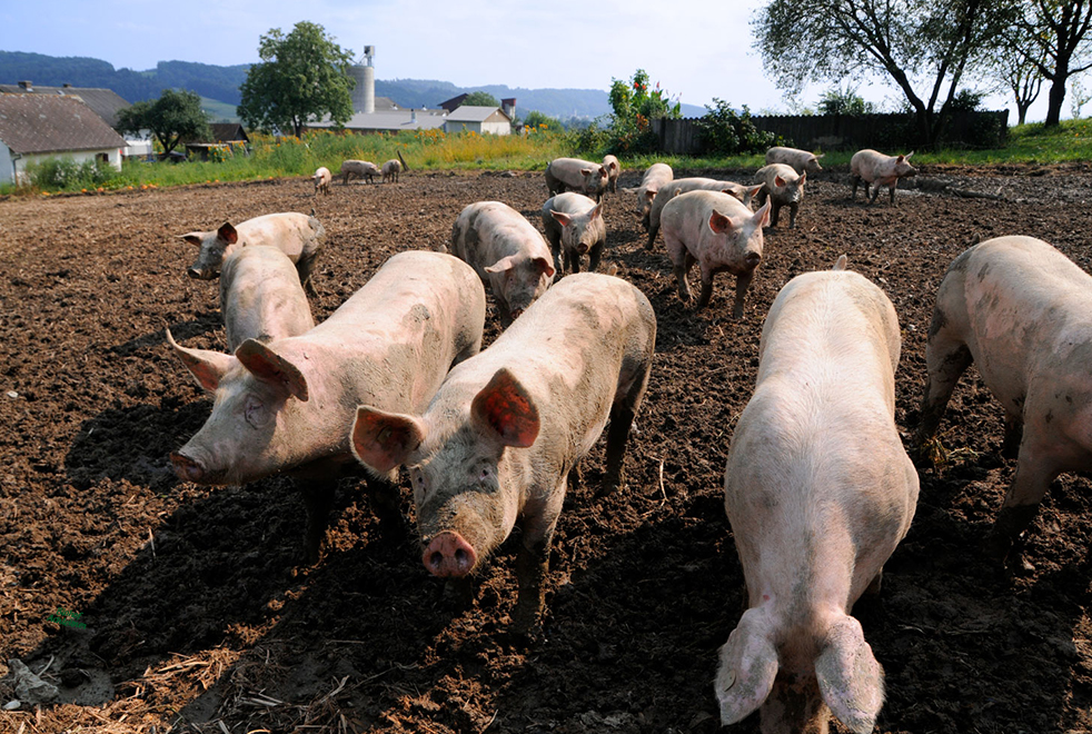 Turopolje (schwarz-weiß-getupft), Schwäbisch-Hällische (schwarz-weiße Blockstreifen), Duroc (rotbraun mit Hängeohren), Pietren (schwarz-weiß gefleckt) und Edelschweine (schweinchenrosa) – diese Vielzahl von Schweine-Rassen darf auf Monscheins Biohof dem Ferkelalter entwachsen und bis zum Rest des Lebens ihre Zeit im Freien verbringen.