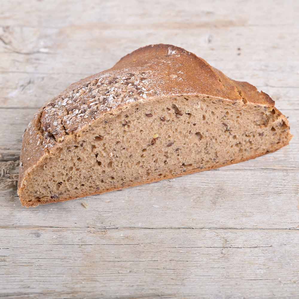 Roggenmehl*, Roggensauerteig* (Trinkwasser, roggenmehl*), Trinkwasser, Salzsole (Trinkwasser, Salz), 3 % Leinsamen*, Gerstenschrot*, Roggenvollkornmalzmehl*, Dinkelflocken*, Brotgewürz* (Kümmel*, Koriander*, Fenchel*)