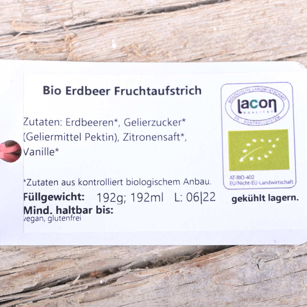 Erdbeeren* (72%), Glierzucker* (Kristallzucker, Geliermittel, Pektin), Zitronensaft*, Vanille*