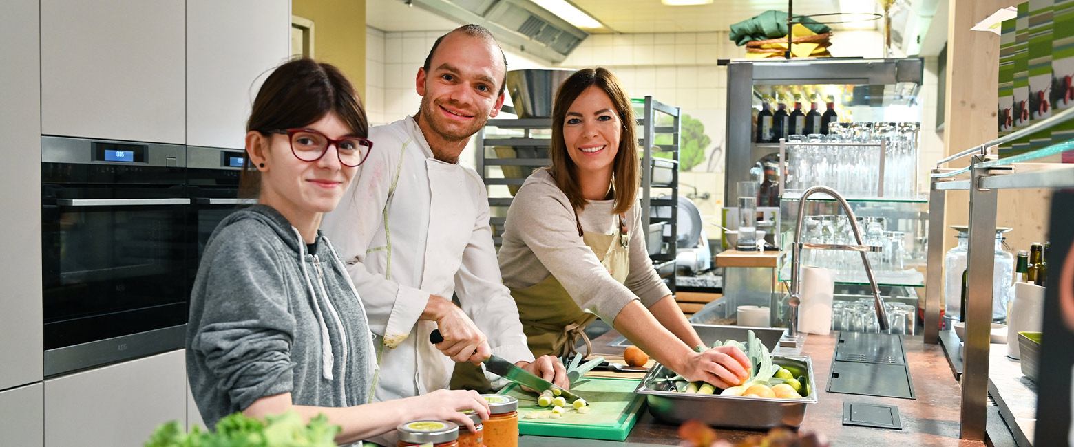 Unsere Hausg'mocht Speisen sind nicht nur aus 100% frischen Bio-Zutaten, sondern haben auch einen ganz besonderen Mehrwert. Im Rahmen des Projekts "Integrative Arbeit" werden unsere Hausg'mocht Gerichte mit tatkräftiger Unterstützung von Menschen aus integrativer Beschäftigung hergestellt. Gresa, Thomas und Co vom Institut Hartheim und von der ARCUS Werkstätte Neufelden schnippeln fleißig Gemüse, helfen beim Abfüllen der Gläser und kümmern sich um das Etikettieren von Suppen, Eintöpfen und Marmeladen im Mehrweg-Glas.