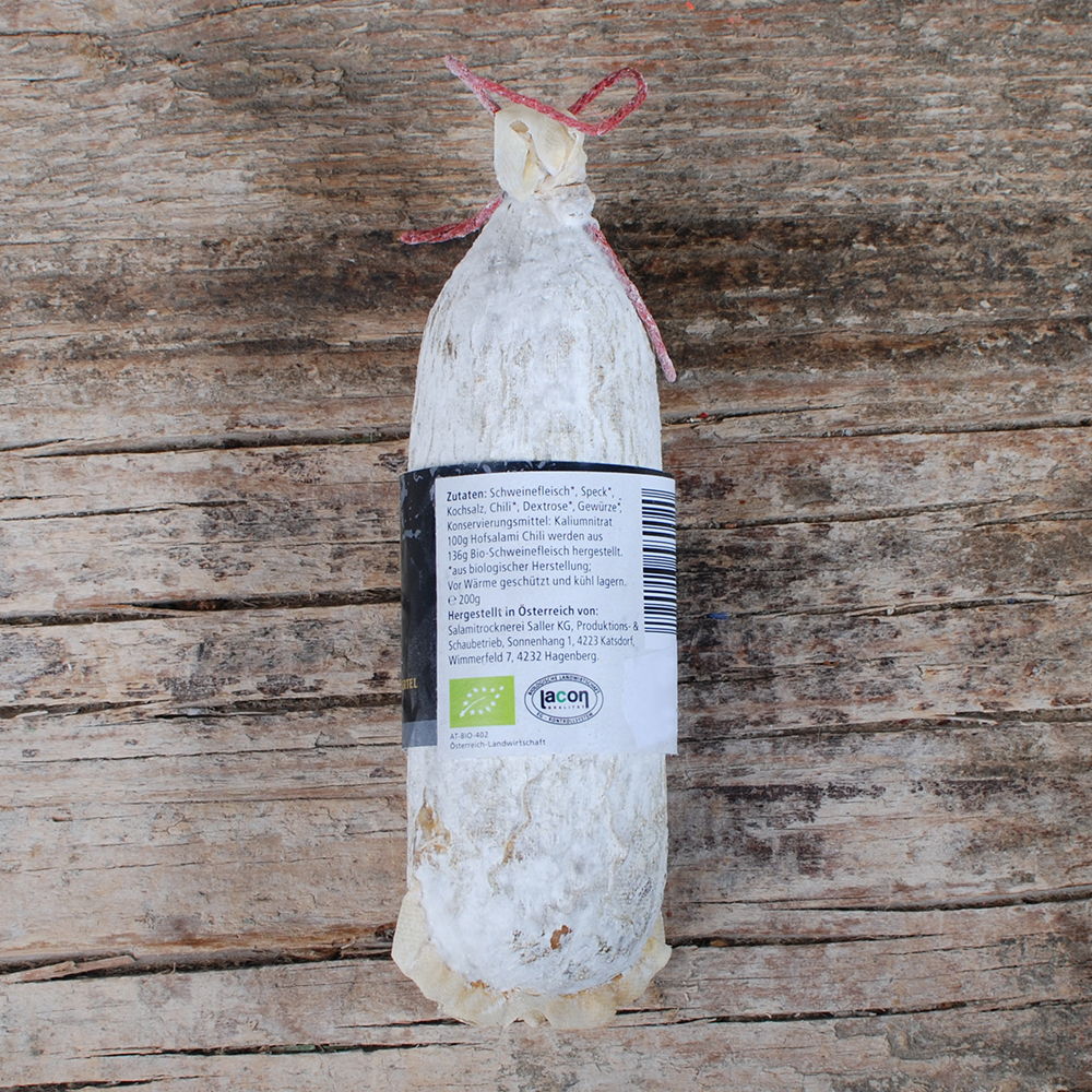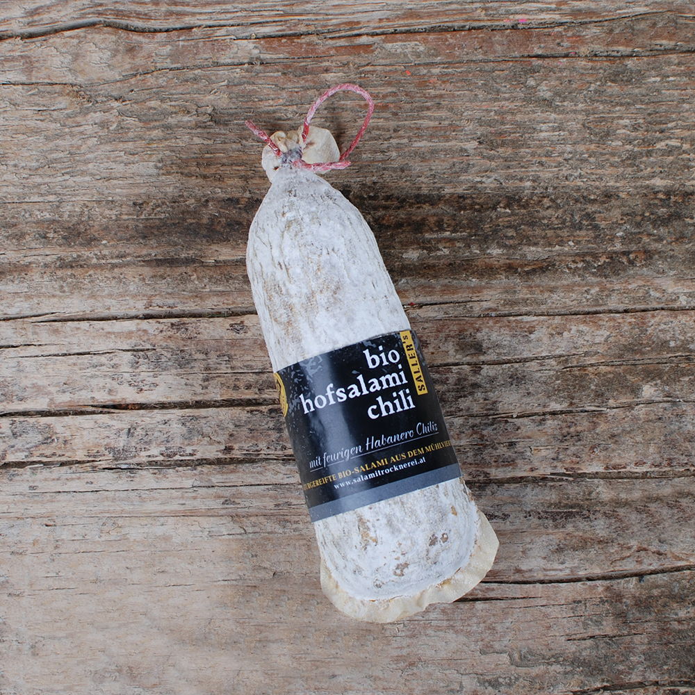 Die g'schmackige Hofsalami Chili überzeugt mit einem scharf-pikanten Aroma durch die verwendeten Chilis – perfekt für eine Antipasti Platte