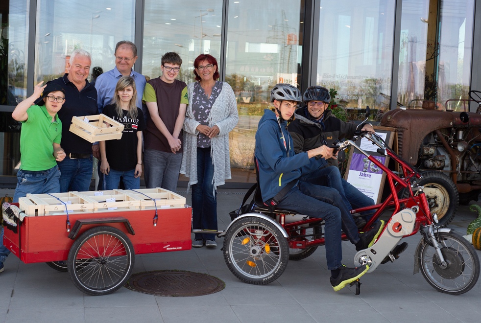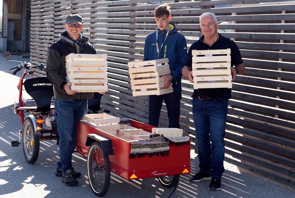 „Sind die nächsten 20 Stück gemacht, so geht es mit dem umweltfreundlichen Fun 2 go-Rad mit Anhänger und selbstgemachtem Aufbau auf zur Übergabe am Biohof“, so Gerhard Lackner (Werkstättenleiter in Strassham). 25,8 km beträgt übrigens die Strecke zum Biohof und zurück zur Werkstatt in Straßham.