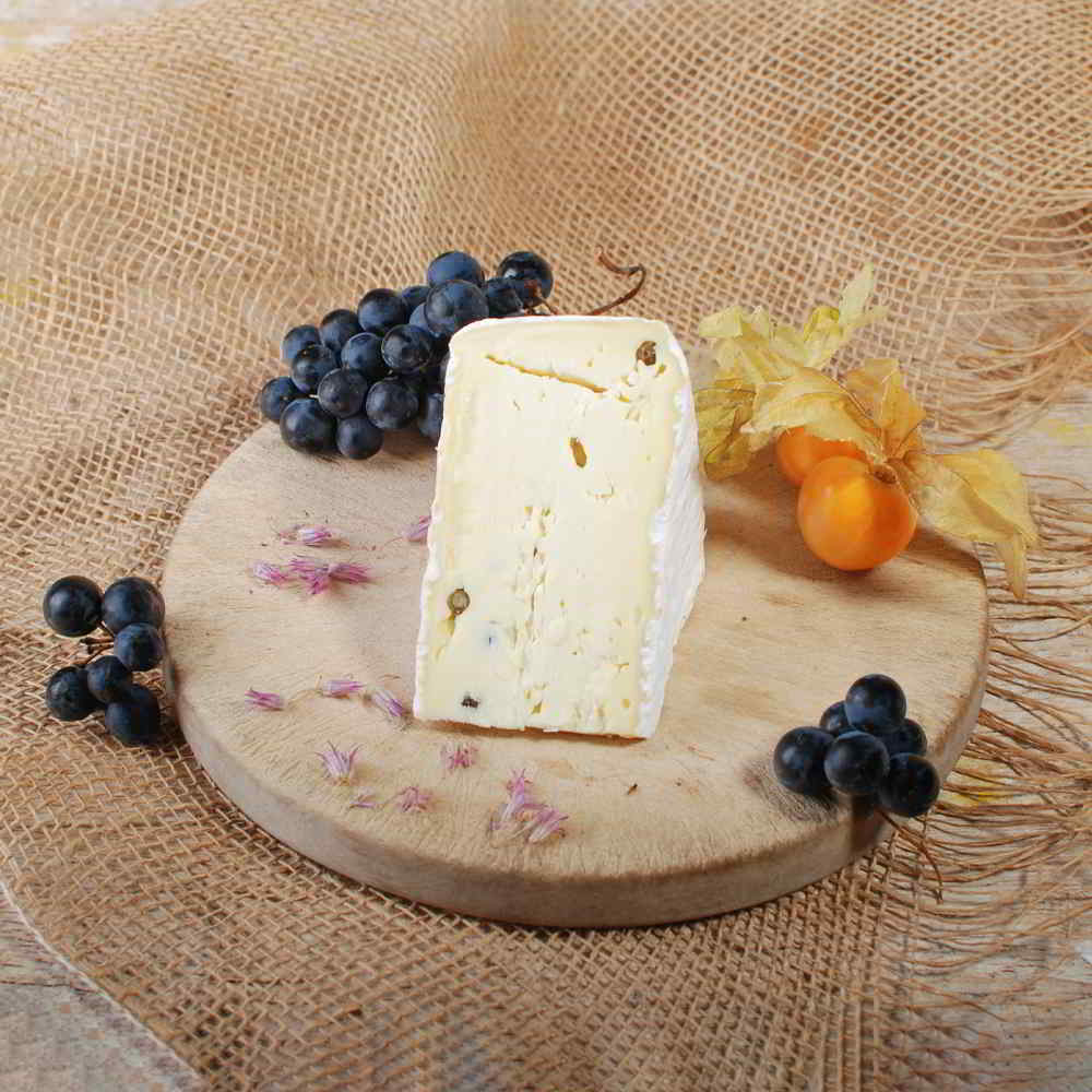 Würzig- scharfer Weichkäse mit Edelschimmelrinde und Pfefferkörner.