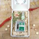 Die Geschenkbox Kräuterzauber vom Kräuterhof Aufreiter beinhaltet einen Tee Apfel Kräuter in der Box, ein Kräutersalz und einen Weihnachtsschmuck