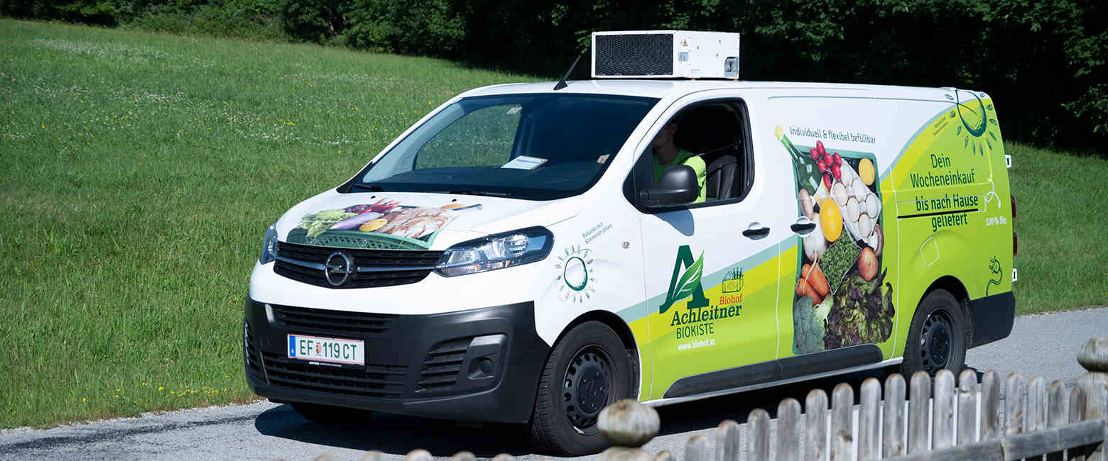 Jede Woche packen wir unsere Biokisten mit erntefrischem Obst & Gemüse, Milchprodukten, Wurst- und Fleischwaren, pflanzlichen Alternativen uvm. und liefern sie mit unseren eigenen Biokisten-Fahrzeugen (darunter nagelneue, innovative Elektrobus mit ökologischer Kühlung) an deine Wunsch-Adresse. Dabei achten wir auf eine umweltschonende Lieferung.