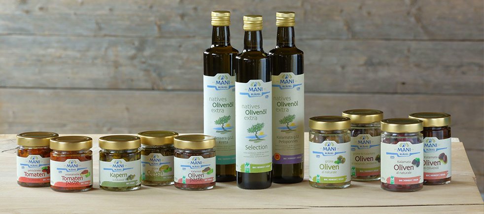Das Sortiment von MANI Bläuel umfasst neben den vielfach prämierten Bio-Olivenölen auch naturreine Bio-Olivenprodukte in Rohkost-Qualität sowie eine bio-zertifizierte Naturkosmetik-Linie hergestellt in Österreich auf Basis des MANI Bio Olivenöls sowie das erste Bio-Hotel Griechenlands, den Mani Sonnenlink.