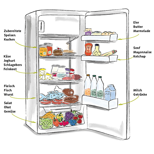 Der Kühlschrank sollte generell auf 2-8 °C eingestellt sein. Durch die Zirkulation der Luft entstehen verschiedene Zonen, die sich für unterschiedliche Lebensmittel am besten eignen (siehe unsere Grafik links).