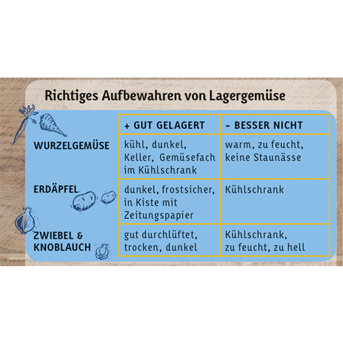Günter Achleitner empfiehlt, Wurzelgemüse und Kartoffeln nach Möglichkeit an einem dunklen, kühlen Ort in etwas Sand einzuschlagen (dieser hält die Feuchtigkeit und bietet Schutz für das Lagergemüse). Äpfel sollten nie zusammen mit Lagergemüse aufbewahrt werden - das von den Äpfeln abgegebene Reifegas Ethylen begünstigt nämlich das Austreiben.