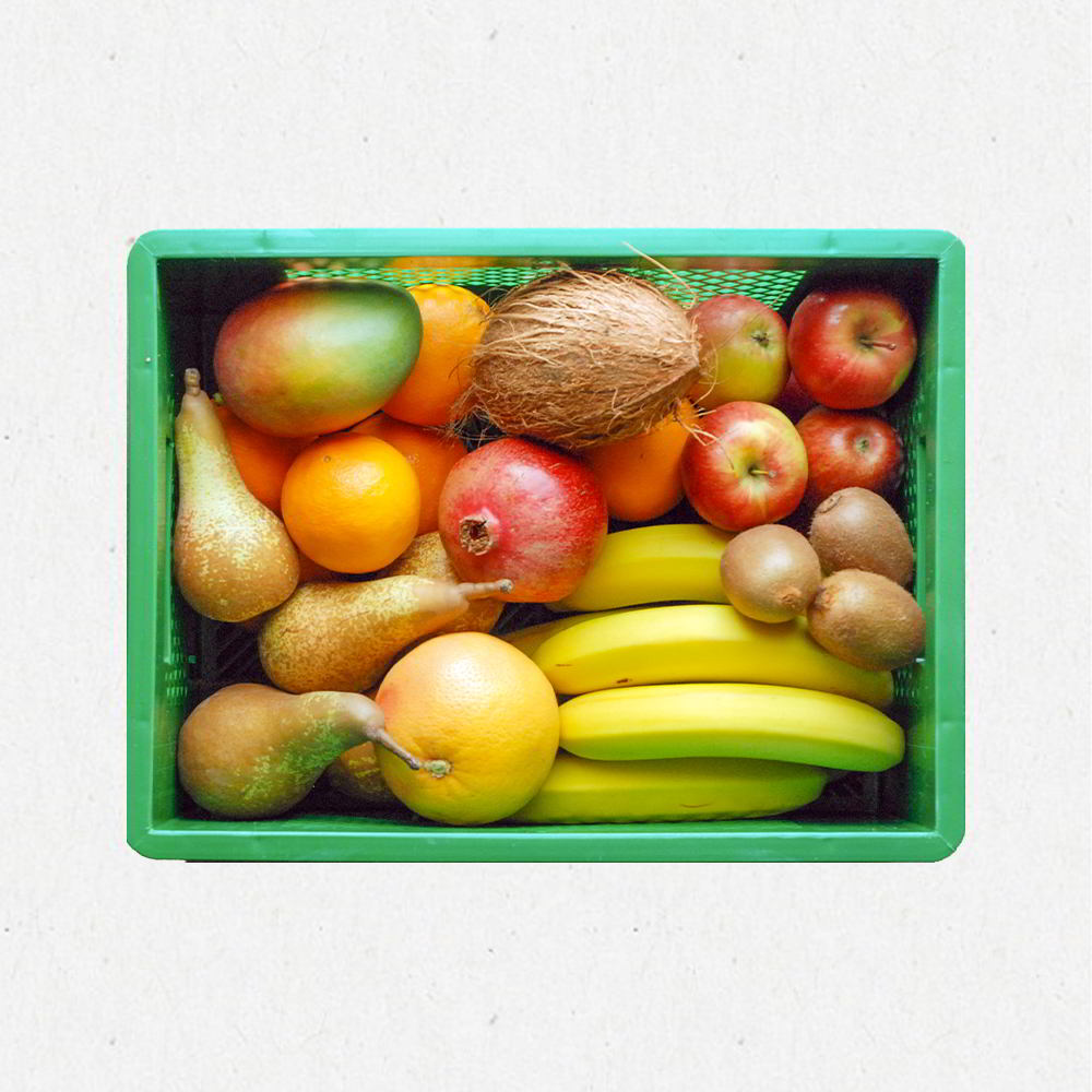 Unsere Obstkiste beinhaltet einen kunterbunten Obstmix (Äpfeln, Bananen, Beeren, Südfrüchten,...).