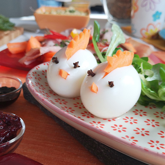 Ist das Eierpecken erledigt, lassen sich hartgekochte Eier noch wunderbar als lustige Hühner für das Osterfrühstück servieren. Diese sehen nicht nur gut aus, sondern schmecken auch wundervoll.