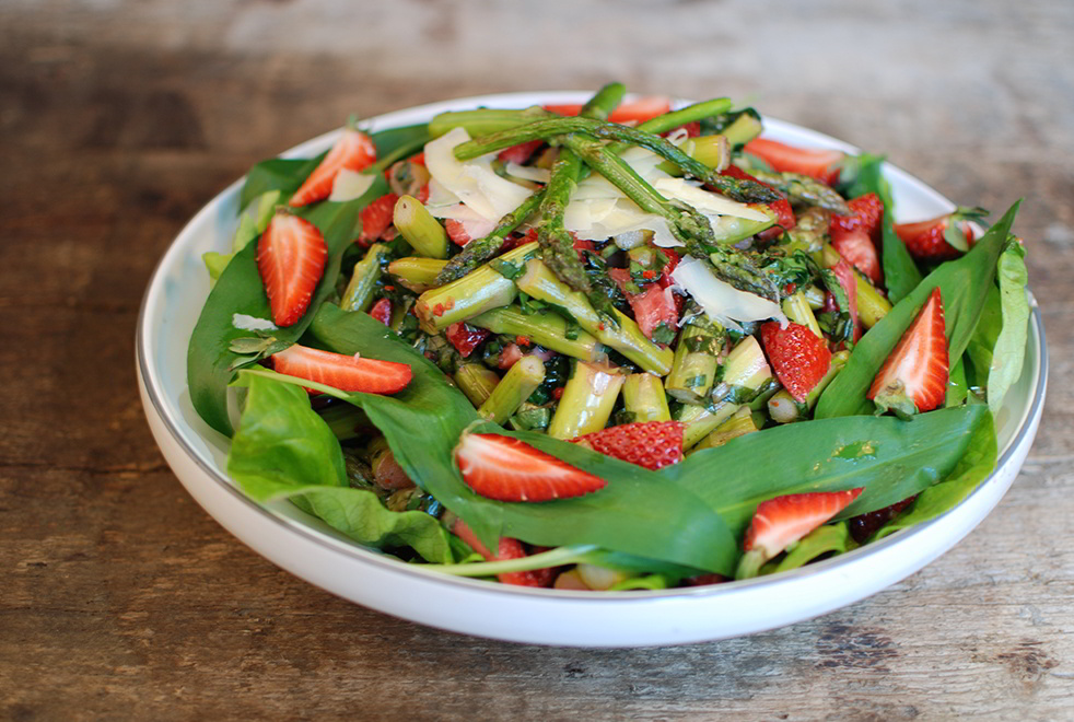 Zum Rezept: Grüner Spargelsalat mit Erdbeeren und Bärlauch