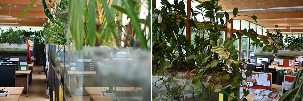 In unseren nachhaltig gestalteten Büros mit Vollholzmöbeln grünt es im wahrsten Sinne des Wortes. Bei der Klimatisierung unserer Räume setzen wir auf die Kraft von hunderten Grünpflanzen, die rund um die Arbeitsplätze verteilt sind und so auch als Raumtrenner fungieren.