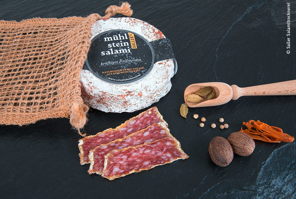 Erwin mietete sich auf dem Hof eines Biobauern in Lasberg ein, der Bio-Schweine füttert und somit die Grundlage für die Salamierzeugung liefert. In Naturdärme abgefüllt reifen die Salamis dort 1 bis 4 Monate - echtes Slow-Food also. Ein spezieller essbarer Edelschimmel sorgt für einen camembertartigen Geschmack in französischer Richtung. Das originellste Produkt ist die Mühlsteinsalami, die dem Charakter von Erwins neuer mühlenreichen Heimat einen starken Ausdruck verleiht und auch als Geschenk sehr gerne weitergereicht wird.
