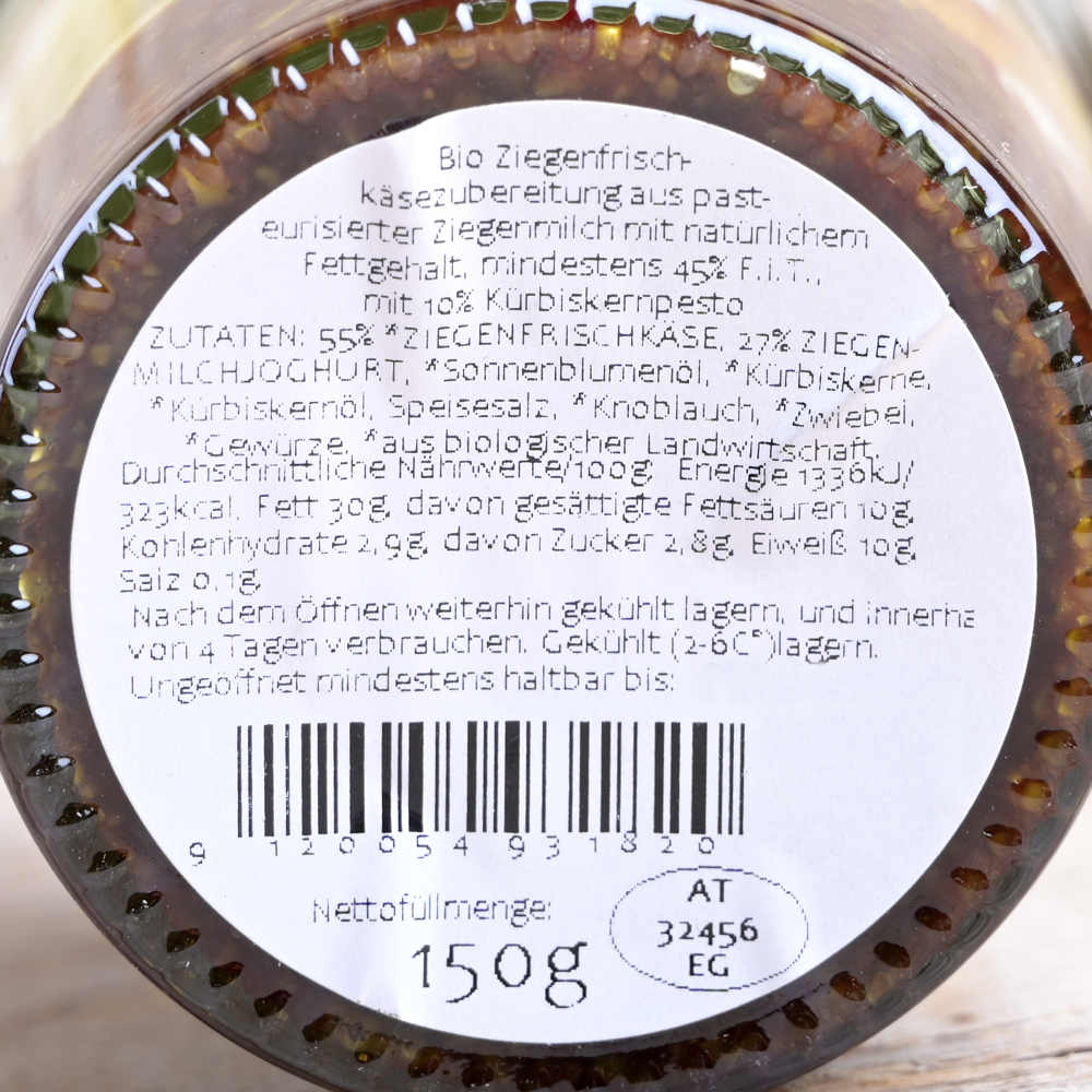 55% ZIEGENFRISCHKÄSE*, 2,7% ZIEGENJOGHURT*, Sonnenblumenöl*, Kürbiskernpesto*, Speisesalz*