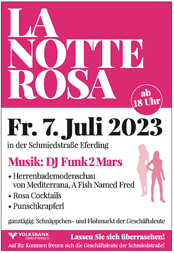 Das Sommerfest in der Schmiedstraße in Eferding läutet den Sommer ein. Unter dem Motto "La Notte Rosa" färbt sich die Einkaufsstraße pink. Alles, was in das Farbschema passt, darf gekostet, geshoppt und getragen werden. Die Geschäfte in der Schmiedstraße bieten Sommer-Schnäppchen, eine Modenschau und haben auch abends länger geöffnet.