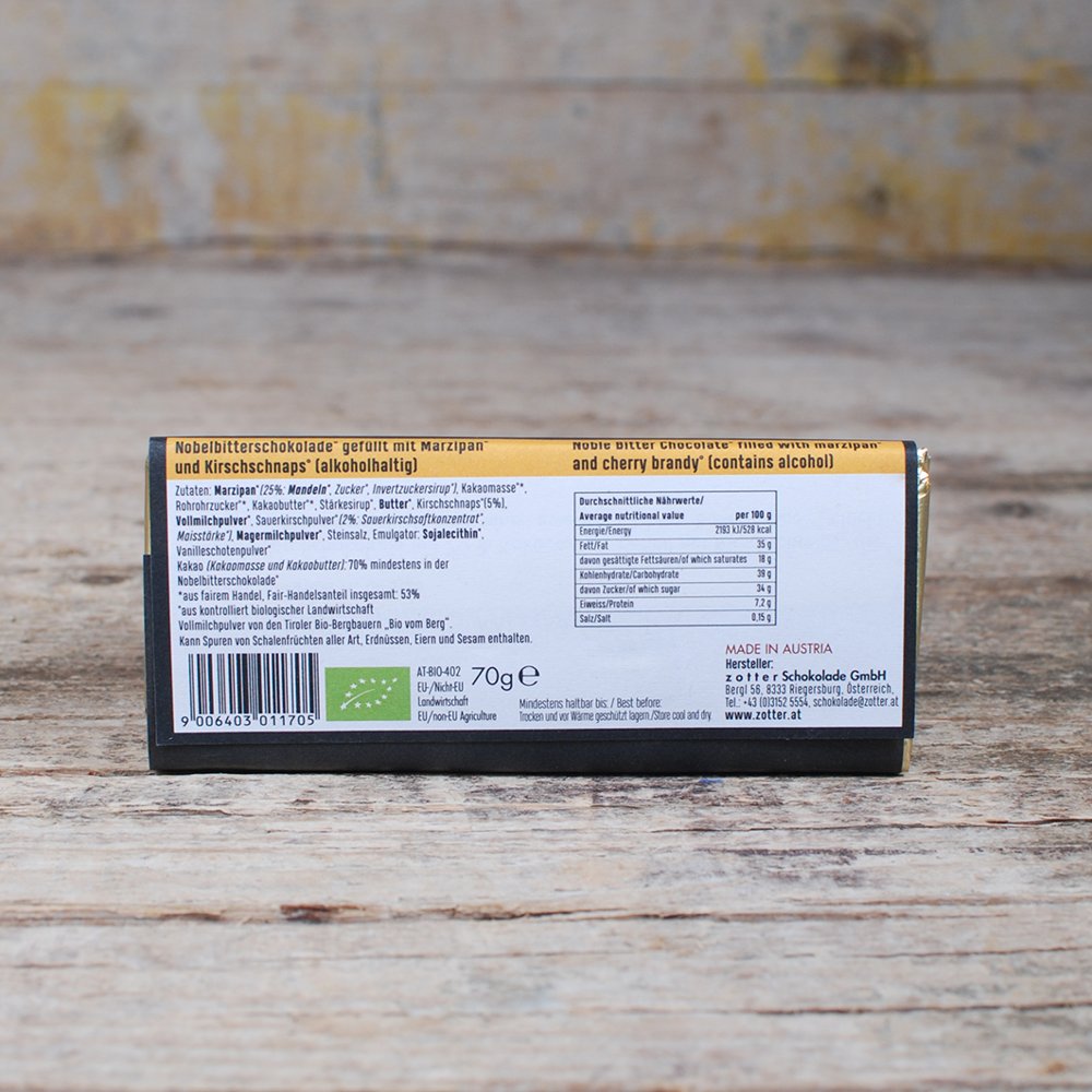Der Schoko Kirschbrand mit Marzipan ist eine himmlische Zusammensetzung aus kräftigem Kirschbrand & feinem Marzipan verschmolzen mit Nobelbitterschokolade