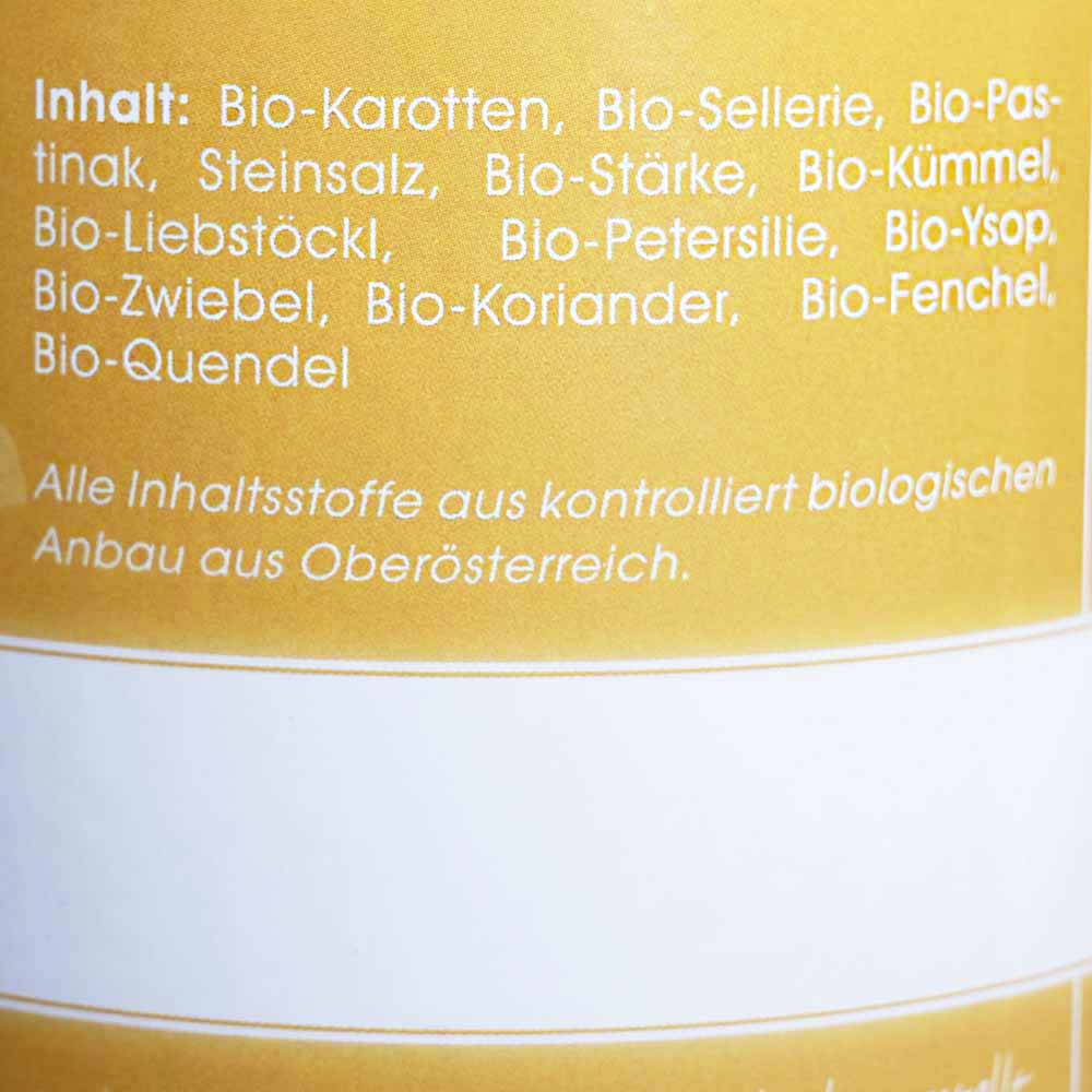 Das Suppengewürz aus frischem Gemüse, wie zB Karotten von unserem Biohof, sowie Kräutern bringt natürlichen Geschmack in deine Suppe