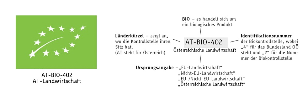 Alle Lebensmittel, die nach den Bio-Verordnungen in der Europäischen Union hergestellt werden, müssen seit Mitte 2010 das grüne EU-Bio-Siegel tragen. Der "Code" unter diesem Symbol beinhaltet ein paar wichtige ergänzende Informationen zur Herkunft und zur Kontrollstelle.